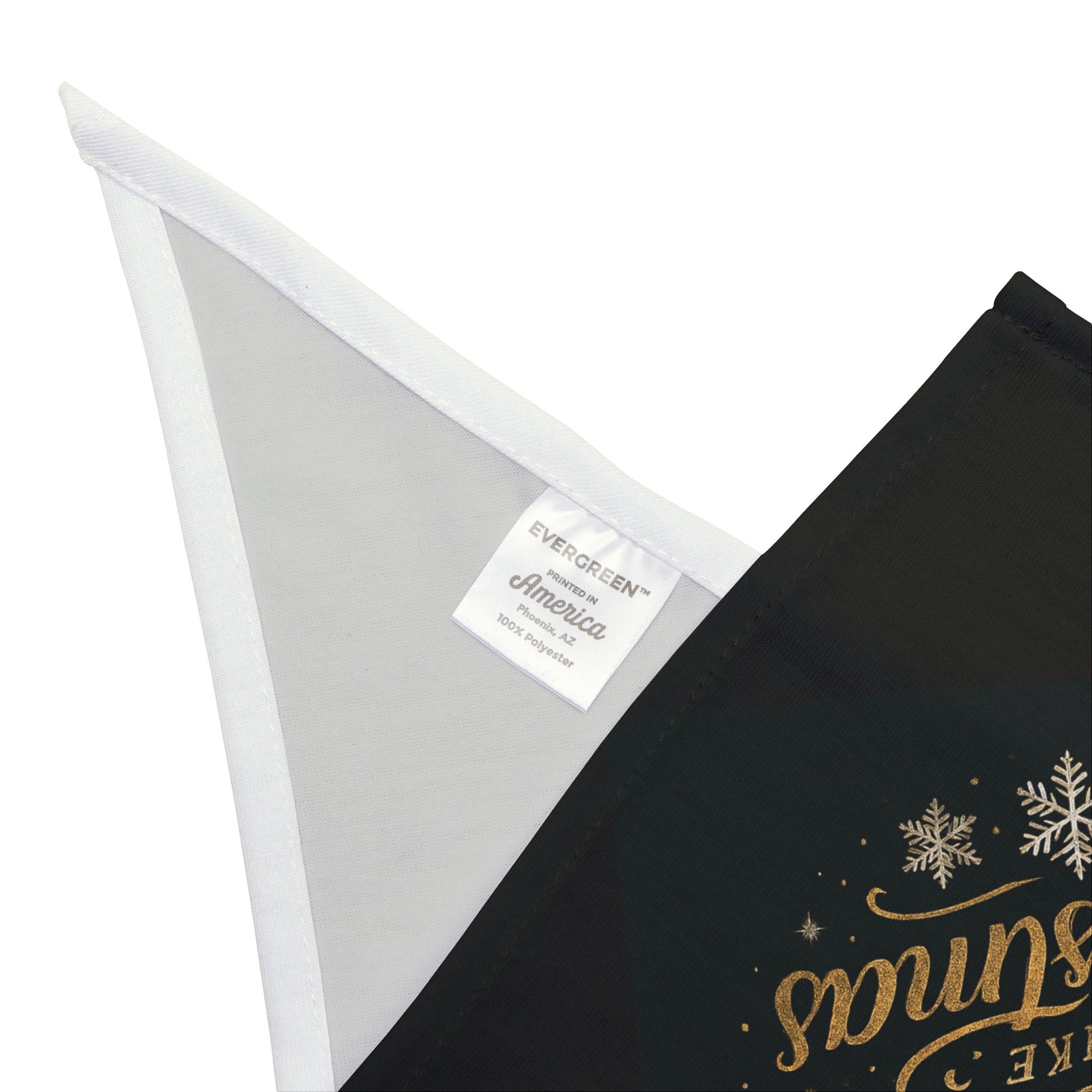 Wrap your dog in a little moment of holiday wonder. This triangular pet bandana carries a warm, vintage-style message — golden lettering and snowflakes on a dark background — that feels like a quiet Christmas evening: twinkling lights, cocoa steam, and the soft shuffle of paws by the tree. Lightweight and quick-drying polyester keeps the shape neat even after play, while hemmed edges and a sewn-in label give it a thoughtful, finished feel. Slip it on for family photos, neighborhood walks, or cozy gatherings to let your pup share in the season without fuss. The design sits on one side so the message stays bold and visible as your pet moves.